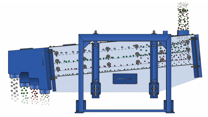 方形搖擺篩啟動后,篩機搖動體即篩箱在慣性力的作用下做前后往復運動,篩箱帶動篩面做周期性搖動,從而使篩面上的物料隨篩箱一同做定向跳躍式運動,期間,小于篩面孔徑的物料通過篩孔落到下層,成為篩下物,大于篩面孔徑的物料經連續翻滾跳躍運動后從排料款排出,完成篩分工作。