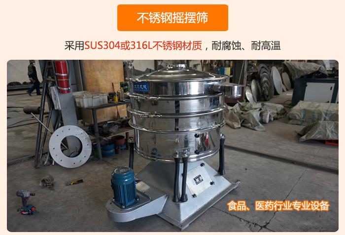 不銹鋼搖擺篩主要采用SUS304或316L不銹鋼材質(zhì),耐腐蝕、耐高溫、不易生銹、不污染原料,是食品、醫(yī)藥行業(yè)專用篩分設(shè)備。由于不銹鋼搖擺篩模擬了人類手工篩分動作和過程,做三維圓周運(yùn)動,巧妙的把篩(平面圓周運(yùn)動)、簸(向上拋物運(yùn)動)結(jié)合起來,既有圓周運(yùn)動,又有上拋運(yùn)動,所以搖擺篩具有篩分精度高、效率高、產(chǎn)量大、篩網(wǎng)壽命長的特點(diǎn)(可達(dá)到普通振動篩的5-10倍),應(yīng)用于各種精細(xì)、超細(xì)范圍內(nèi)的微粒狀物料,更加適合難以處理的物料。