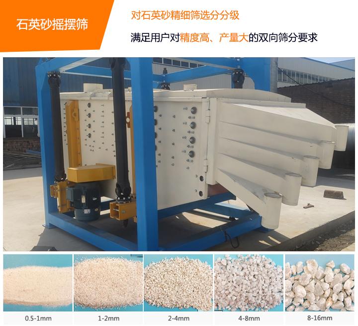 石英砂搖擺式主要是對石英砂精細篩選分級,石英砂搖擺篩篩網常用規格有:0.5-1mm、1-2mm、2-4mm、4-8mm、8-16mm、16-32mm、10-20目、20-40目、40-80目、100-250目。石英砂搖擺篩是解決因旋振篩精度高但產量小、直線篩產量大但精度低這類篩分問題而設計的,該款設備設計預案中具備了篩分精度高、產量大的特性,可以滿足用戶對精度、產量雙向要求的篩分要求。