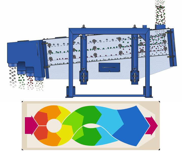 石英砂方形搖擺篩的篩箱在慣性力的作用下作前后往復運動,并帶動篩面做周期性搖動,促使篩面上的物料隨篩箱一同做定向跳躍式運動,小于篩面孔徑的物料通過篩框落到下層,稱為篩下物,大于篩面孔徑的物料經連續翻滾跳躍運動后從前端排料口排出,繼而完成篩分作業。